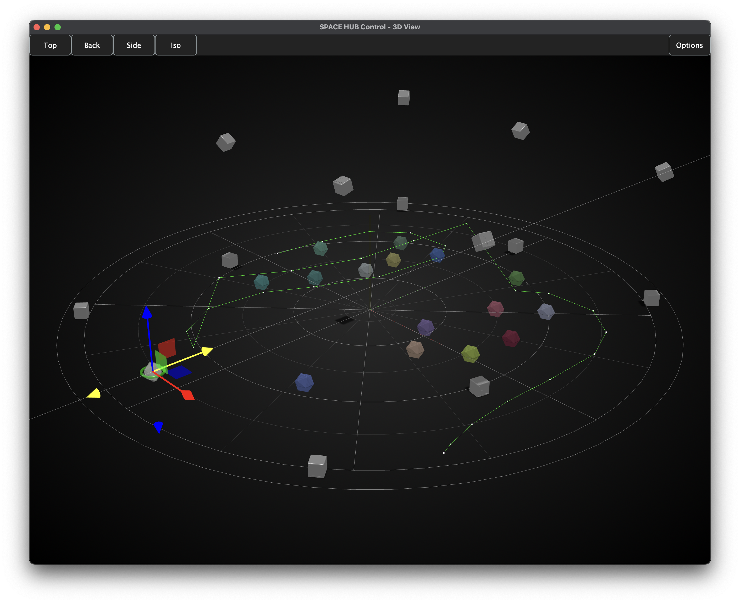 Double-click an Object to move it in 3D space. There is a green ring around the selected Object. Hold ctrl and click additional Objects for multiple selection. Object selection is synchronized between 2D view, 3D view and Object lists. Once the mouse hovers above the selected Object, additional movement tools appear. Use the directional arrows to move the Object along a single axis. Use the coloured squares (blue, green and red) to move the Object on one plane (XY, XZ or YZ).